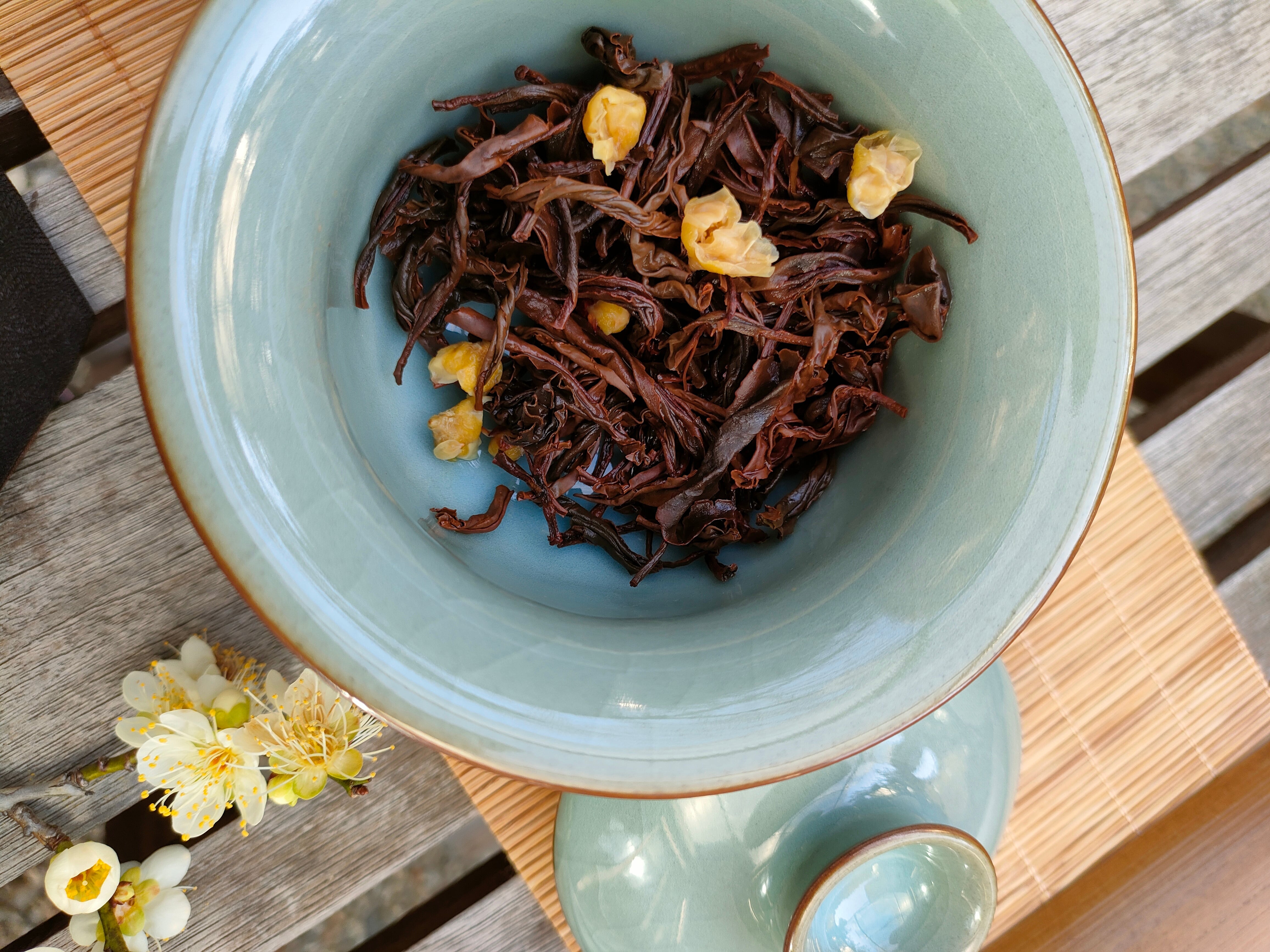 本品は花紅茶で、摘みたての緑萼白梅でに香り付けした正山小種(ラプサン・スーチョン)です。